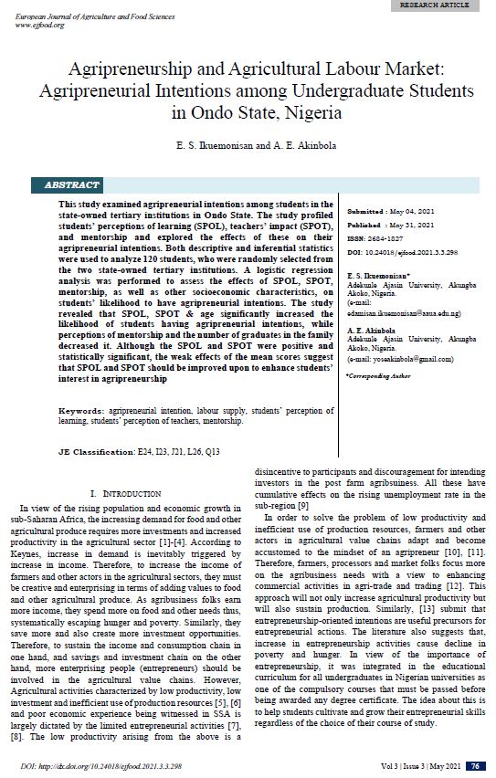 Agripreneurship and Agricultural Labour Market: Agripreneurial Intentions among Undergraduate Students in Ondo State, NigeriaAgripreneurship and Agricultural Labour Market: Agripreneurial Intentions among Undergraduate Students in Ondo State, Nigeria