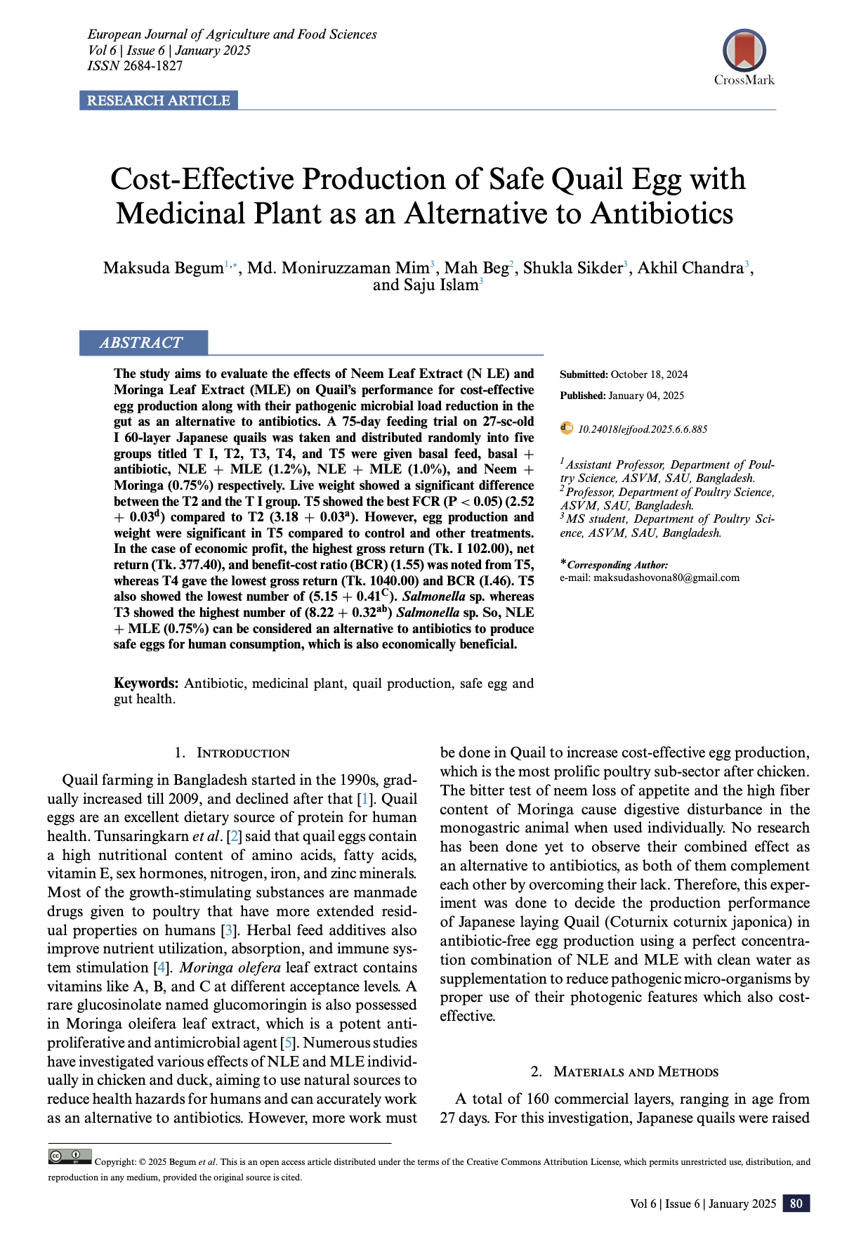 Cost-Effective Production of Safe Quail Egg with Medicinal Plant as an Alternative to Antibiotics