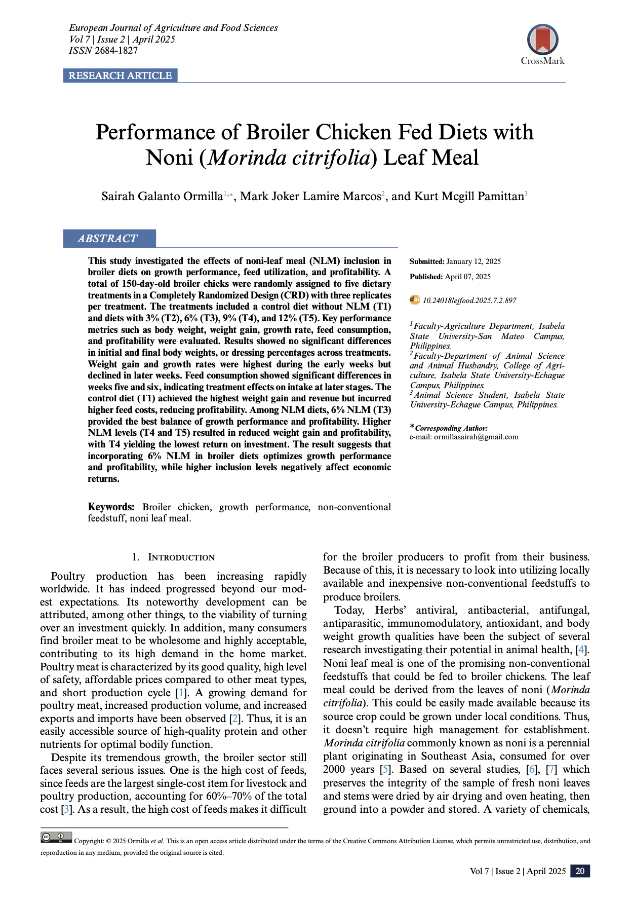 Performance of Broiler Chicken Fed Diets with Noni (Morinda citrifolia) Leaf Meal